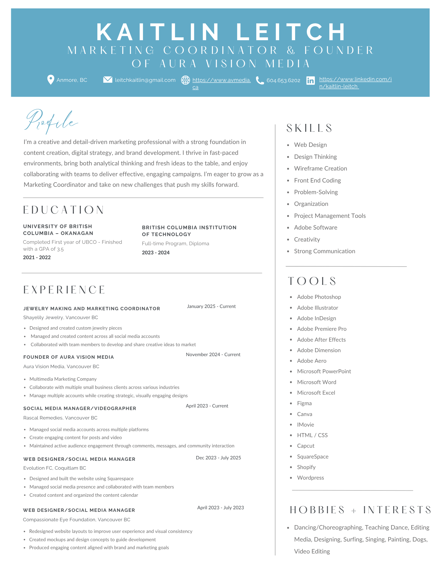 I am a creative and detail-driven Marketing Coordinator and the founder of Aura Vision Media, based in Anmore, BC. With a strong foundation in content creation, digital strategy, and brand development, my background is rooted in the arts, beginning with dance at age five and evolving into a passion for digital media and marketing. After studying in the New Media and Web Development program at BCIT, I developed a well-rounded skill set that blends creativity with technical expertise. I thrive in fast-paced, collaborative environments, bringing both analytical thinking and fresh ideas to the table to deliver effective and engaging campaigns. I am eager to continue growing as a Marketing Coordinator and take on new challenges that push my skills forward.